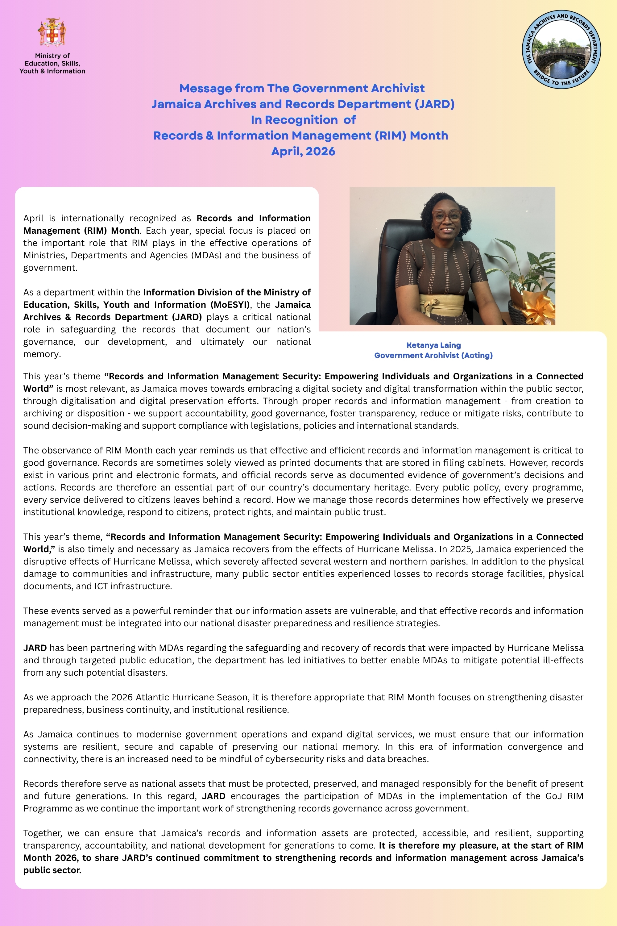 | While the Government Records Centre is temporarily closed, the Audio-Visual Unit located at 36-38 Red Hills Road and Jamaica Archives Unit located at 27 King Street, Spanish Town are still open.
